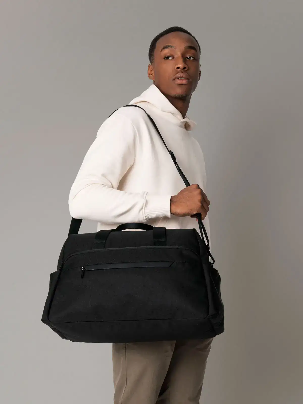 100% poliestere riciclato 600D. Borsone in stile minimalista, con manico, scomparto principale con zip, fodera interna con finitura premium, tre tasche portaoggetti all'interno dello scomparto principale, due grandi tasche a soffietto all'estremità, tasca posteriore con cerniera che funge da manicotto da far scorrere sulla maniglia della valigia, tasca frontale esterna con cerniera e patta antipioggia e tasche interne a scorrimento, tracolla regolabile staccabile. Etichetta removibile. Dimensioni: 40x30x20cm (adatto alla maggior parte delle compagnie aeree).