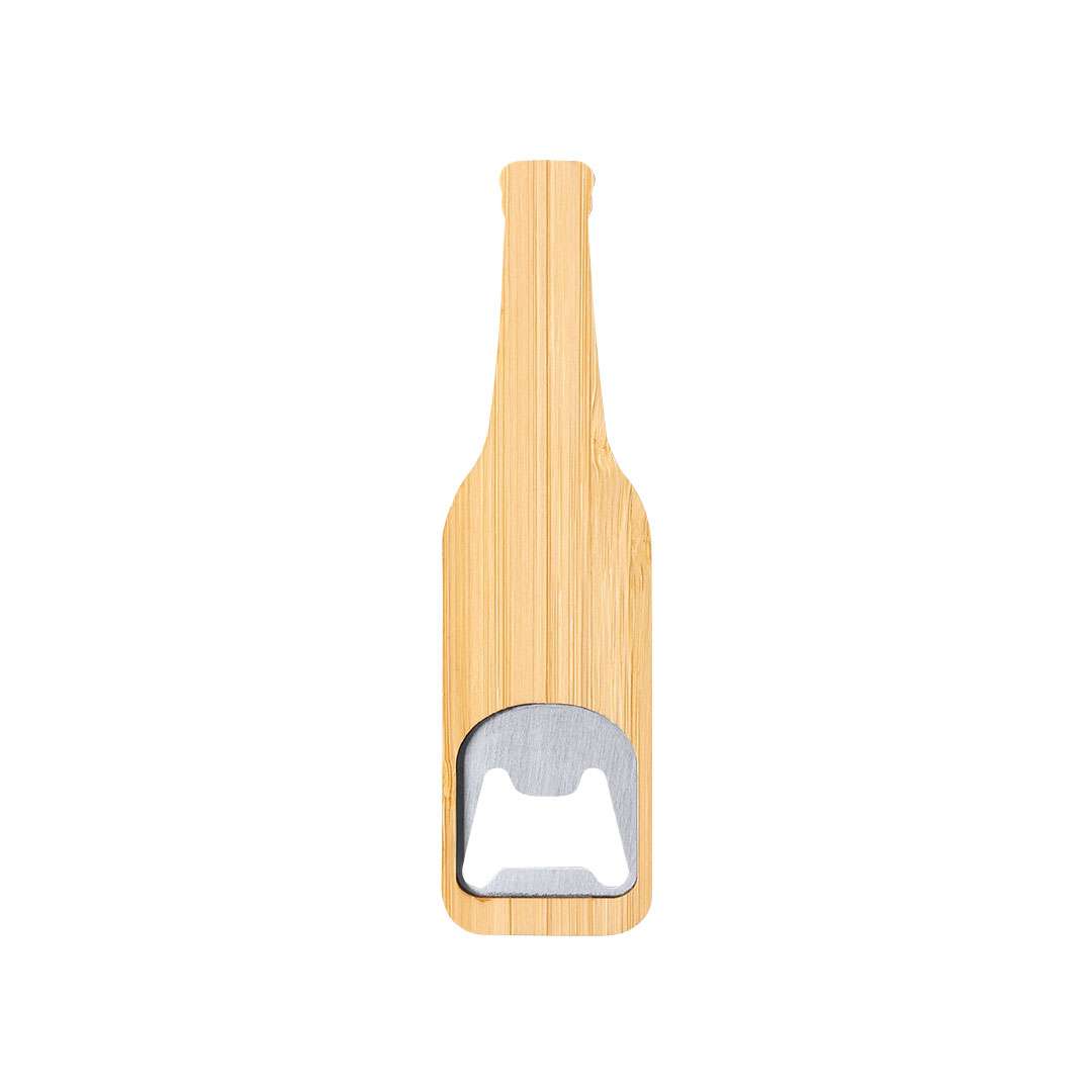Apribottiglie a forma di bottiglia in bambù e metallo.I materiali come il bambù incoraggiano l'uso di materie prime naturali riducendo le emissioni inquinanti. Inoltre, il bambù proviene da una pianta di grande resistenza e versatilità, con crescita e rigenerazione rapida, rappresentando un'ottima alternativa all'uso del legno tradizionale.
