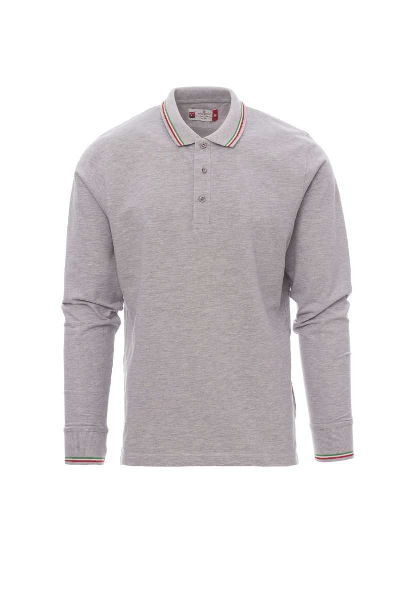 Polo unisex a manica lunga a 3 bottoni in tinta, collo e polsino con fine profilo tricolore in contrasto, colletto e polsino a costine, spacchetti laterali, cuciture del collo coperte, nastro di rinforzo laterale, rinforzo sagomato retrocollo