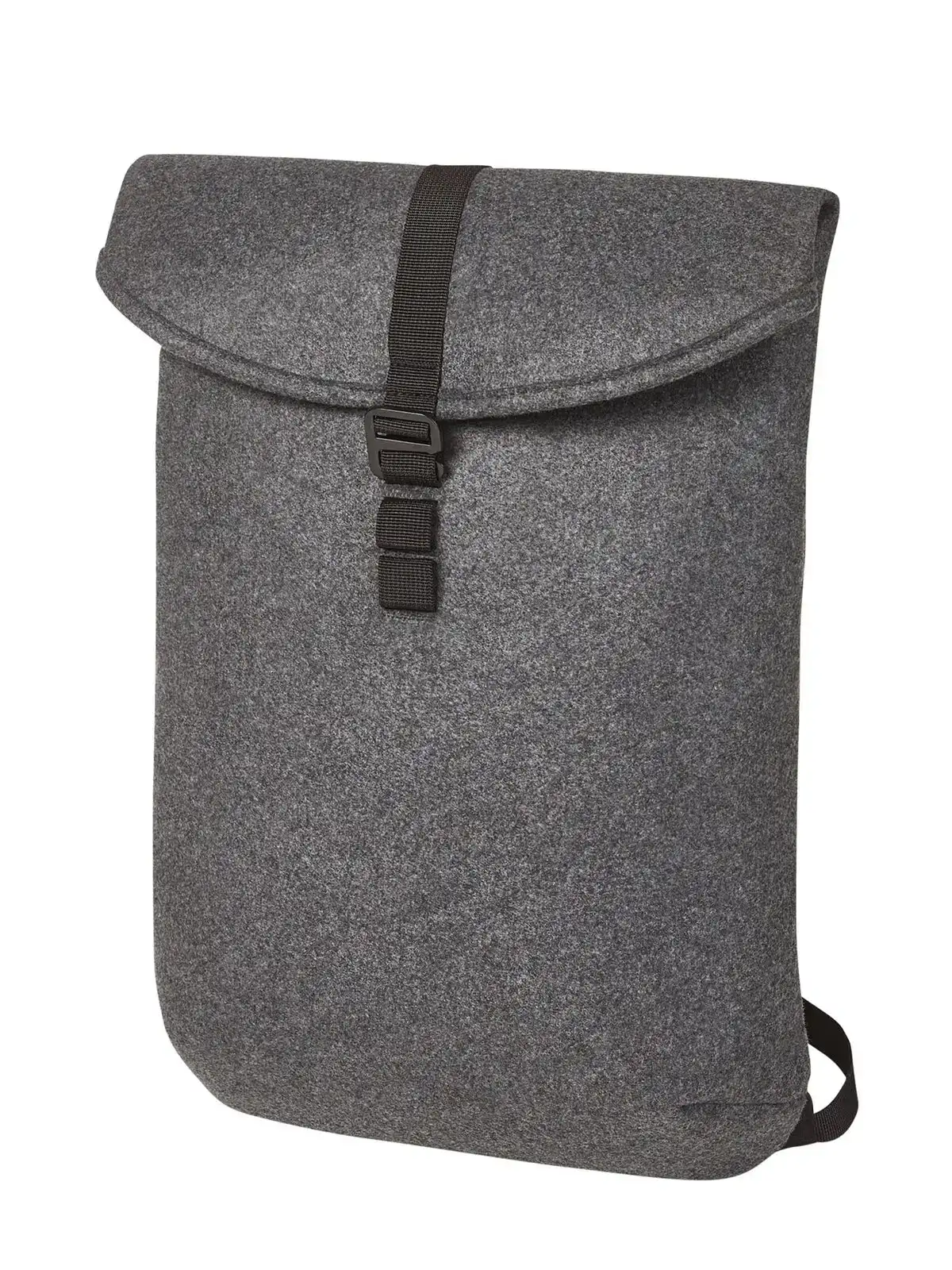 100% feltro in poliestere riciclato. Zaino in feltro con manico, chiusura regolabile con fascia ad anello e chiusura metallica. Tasca imbottita per dispositivi elettronici, schienale imbottito con tracolla regolabile in lunghezza. Tasca a inserto con chiusura lampo nascosta sul retro.