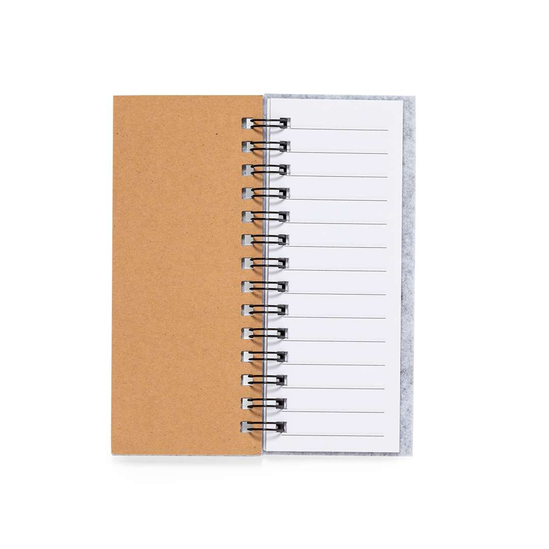 Block notes in morbido feltro RPET. Con logo RPET sulla copertina. Include:Raccoglitore ad anelli da 30 fogli bianchi con layout a righe e etichetta riciclato su entrambi i lati.25 note adesive medie.125 mini note adesive in vari colori.Presentato in un sacchetto individuale riciclato.