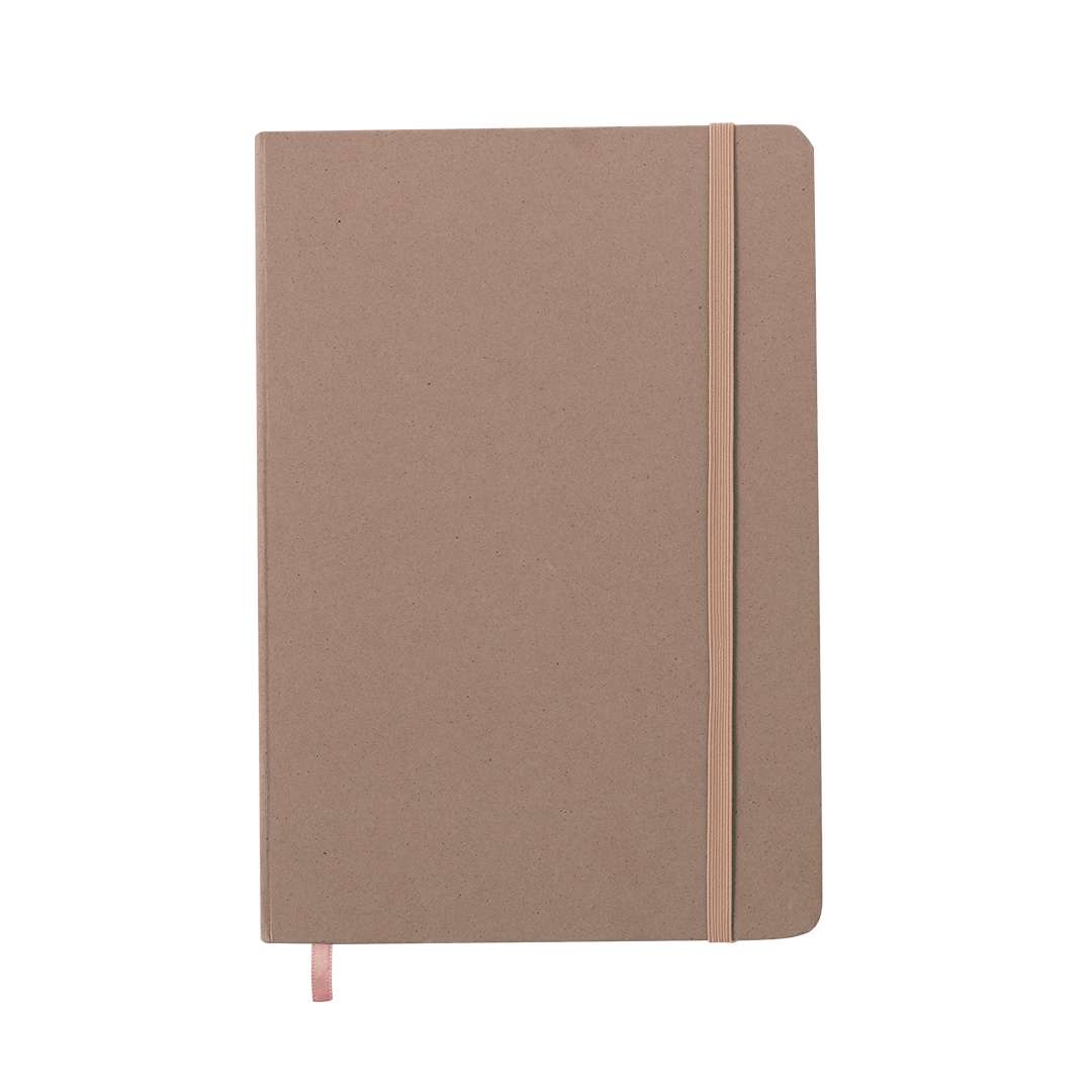 Block notes A5 con copertina rigida realizzata con materiali derivati dalla frutta. All'interno 80 fogli a righe, con segnalibro ed elastico coordinati. Disponibile in colori assortiti con finitura kraft. Include il logo Fruit Paper sul retro della copertina. Presentato in un sacchetto individuale riciclato.Mescolando gli scarti e i residui dell'industria agroalimentare con altri materiali riciclati, si ottiene una carta sostenibile al 100%: la carta frutta. Incoraggiarne l'uso contribuisce al riutilizzo dei materiali e a un maggiore impegno ambientale.
