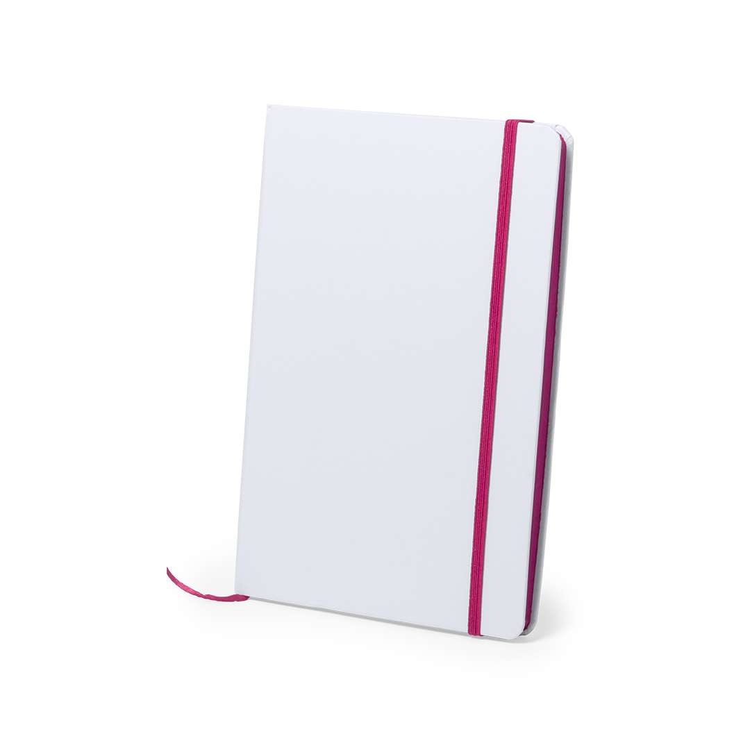 Block notes con copertina rigida soft-touch di colore bianco. Di 100 fogli a tinta unita con dorso in colori divertenti, rilegatura elastica e segnalibro in tessuto coordinati.
