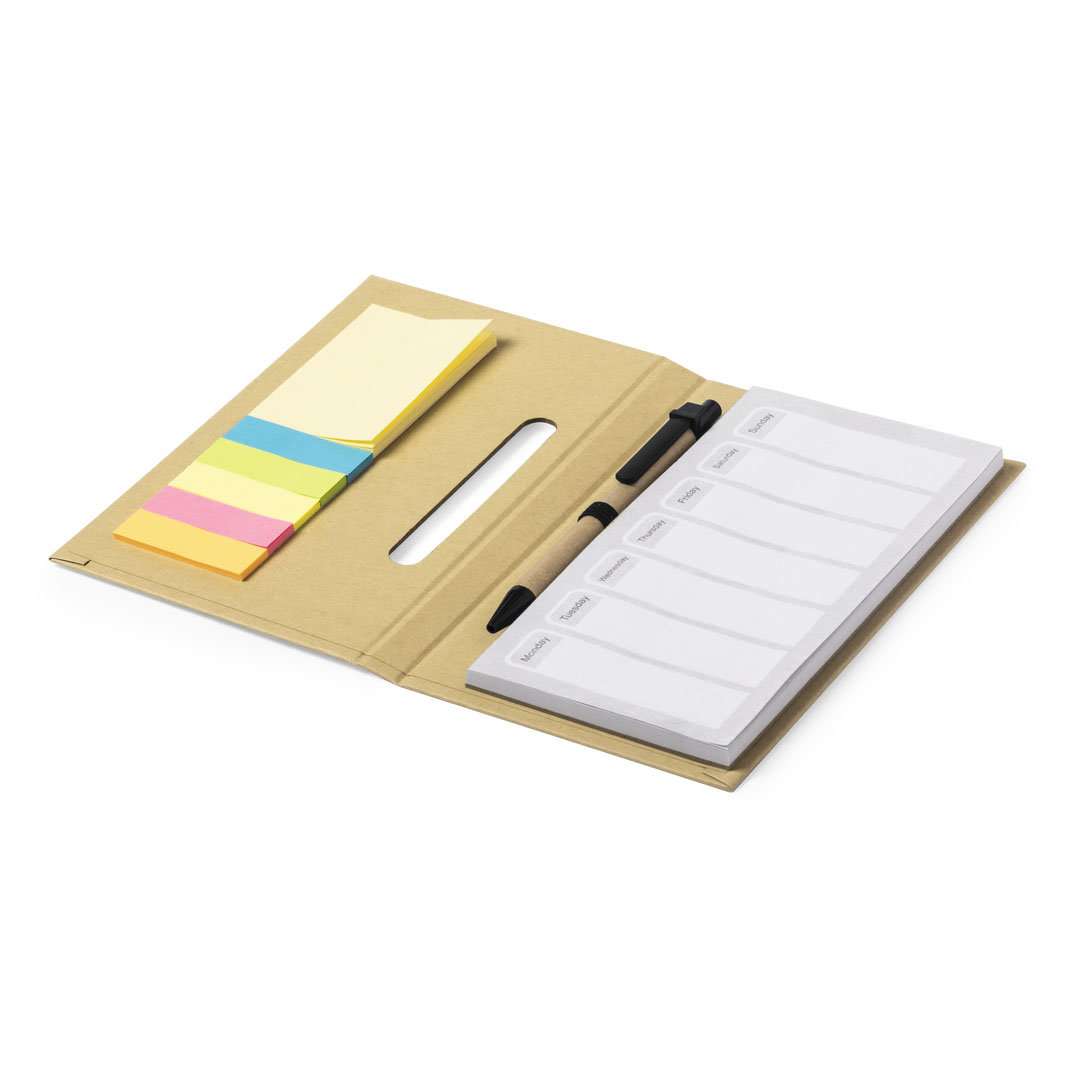 Blocco note e penna online Nature con perpetua agenda settimanale. Copertine rigide in cartone riciclato con un portapenne e 60 fogli di pianificazione settimanali. Include 25 note adesive medie e 125 mini note adesive. Con penna a sfera e inchiostro blu corpo in cartone riciclato.