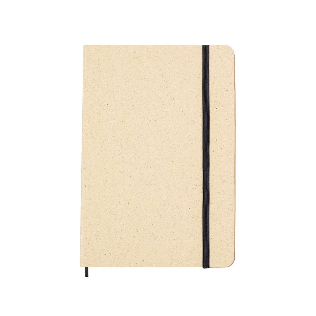 Block notes A5 con copertina rigida realizzata con erbe riciclate. 80 fogli con layout a righe singole e finitura kraft, con segnalibro ed elastico in nero. Logo Grass Paper sulle pagine e sul retro della copertina. Presentato in una busta individuale. La carta d'erba è un'alternativa perfetta che garantisce la sostenibilità del suo processo di produzione, riducendo l'impatto ambientale grazie alla rapida crescita e alla scarsa richiesta di risorse necessarie per la sua coltivazione. Inoltre, il 50% di carta a base di erba è combinato con altri elementi ecologici, come il legno riciclato.