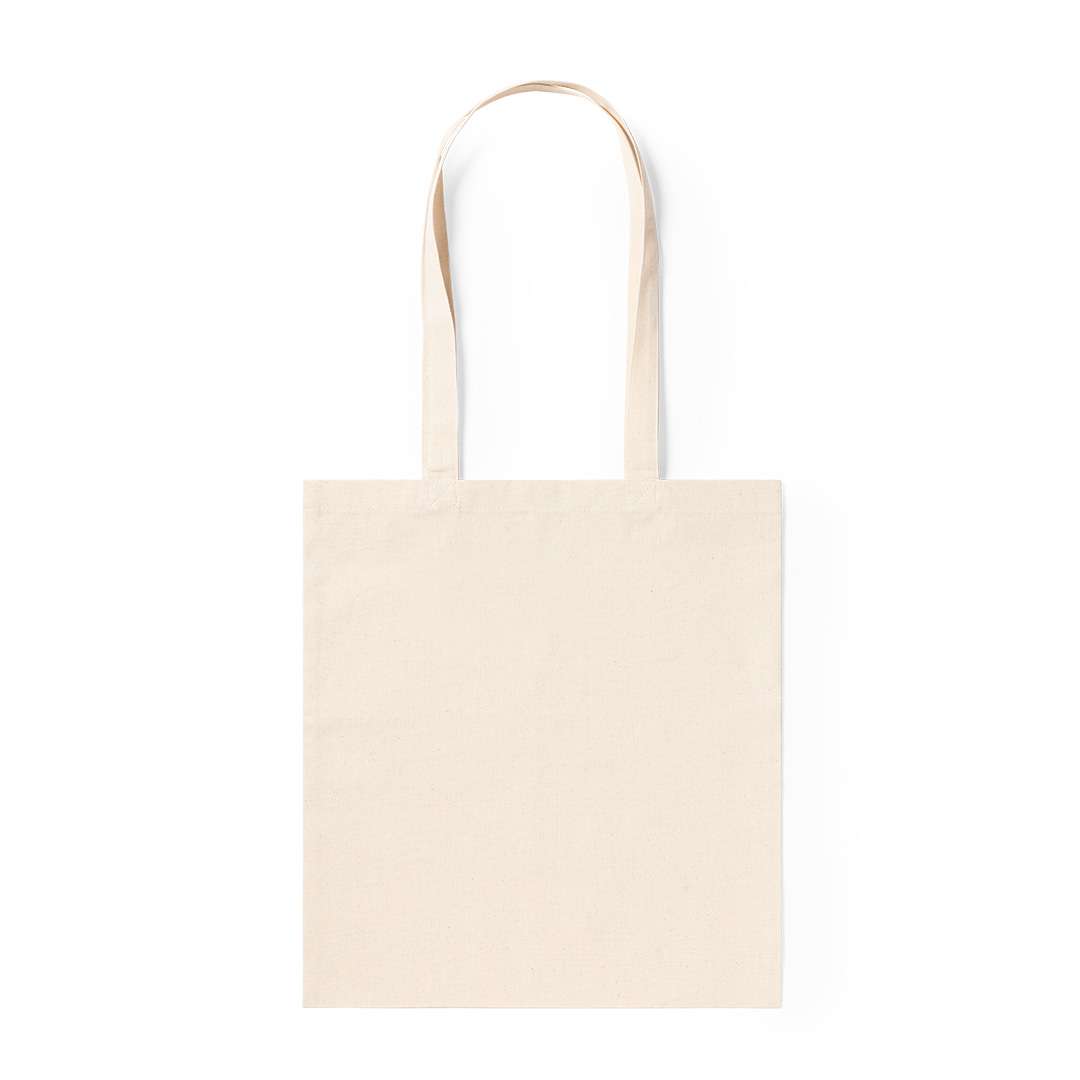Shopper in robusto materiale cotone 140g/m2 con finitura in colore naturale. Con manici lunghi 70 cm e finiture cucite. Resistenza fino a 7 kg di peso.