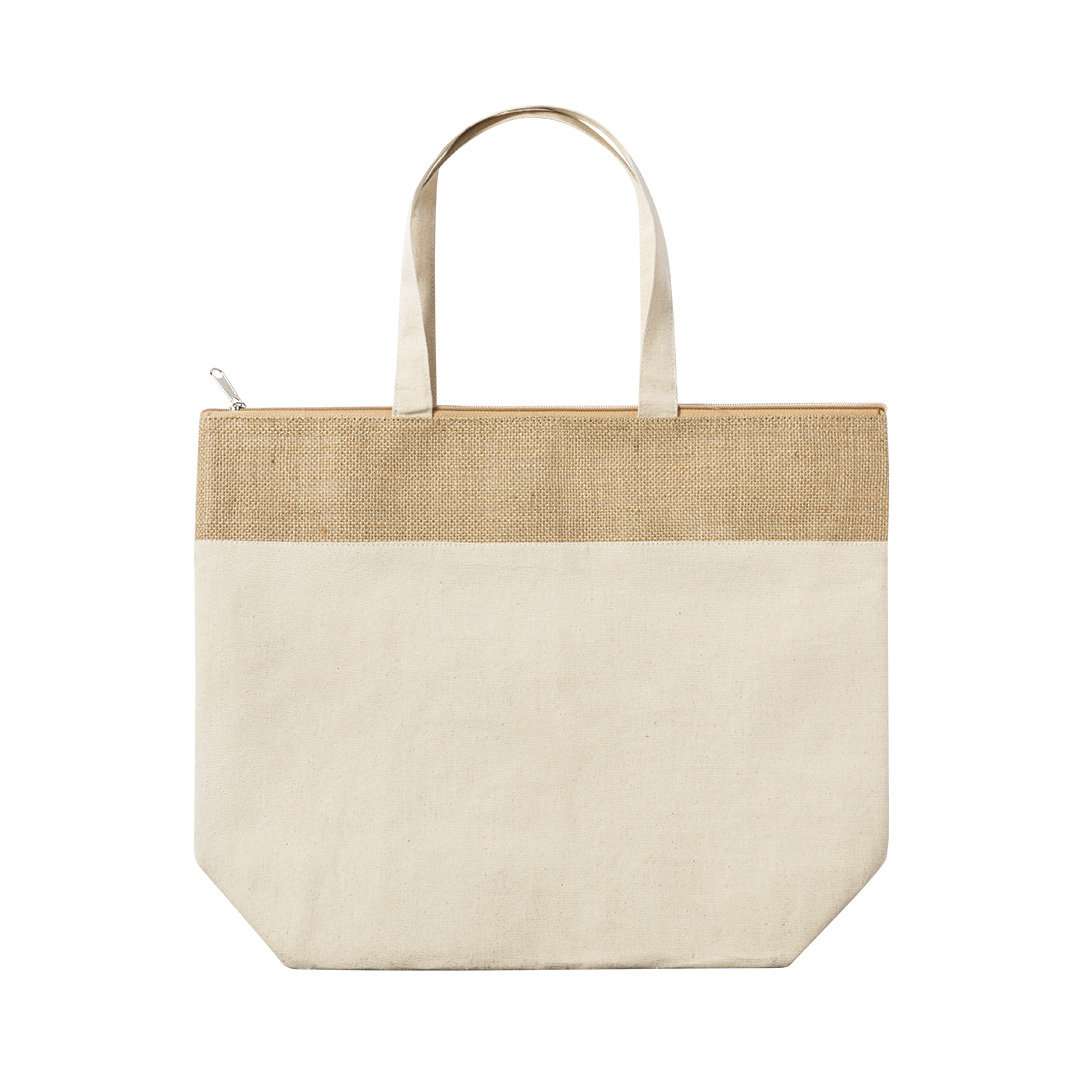Borsa termica in materiale resistente cotone 225g/m2, con parte superiore in juta laminata e manici in cotone. Scomparto principale con zip e tiretto in metallo, con interno isotermico in alluminio. Finitura cucita, con manici rinforzati e resistenza fino a 7 kg di peso.