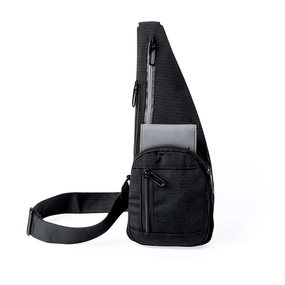 Borsa tracolla in poliestere 300D con tasche multiple per un'organizzazione efficace. Due tasche principali si trovano sulla parte anteriore e laterale, mentre altre due sono situate sulla parte anteriore e posteriore. La tasca centrale è dotata di una striscia riflettente per una maggiore visibilità. Confezionata singolarmente in un sacchetto riciclato.