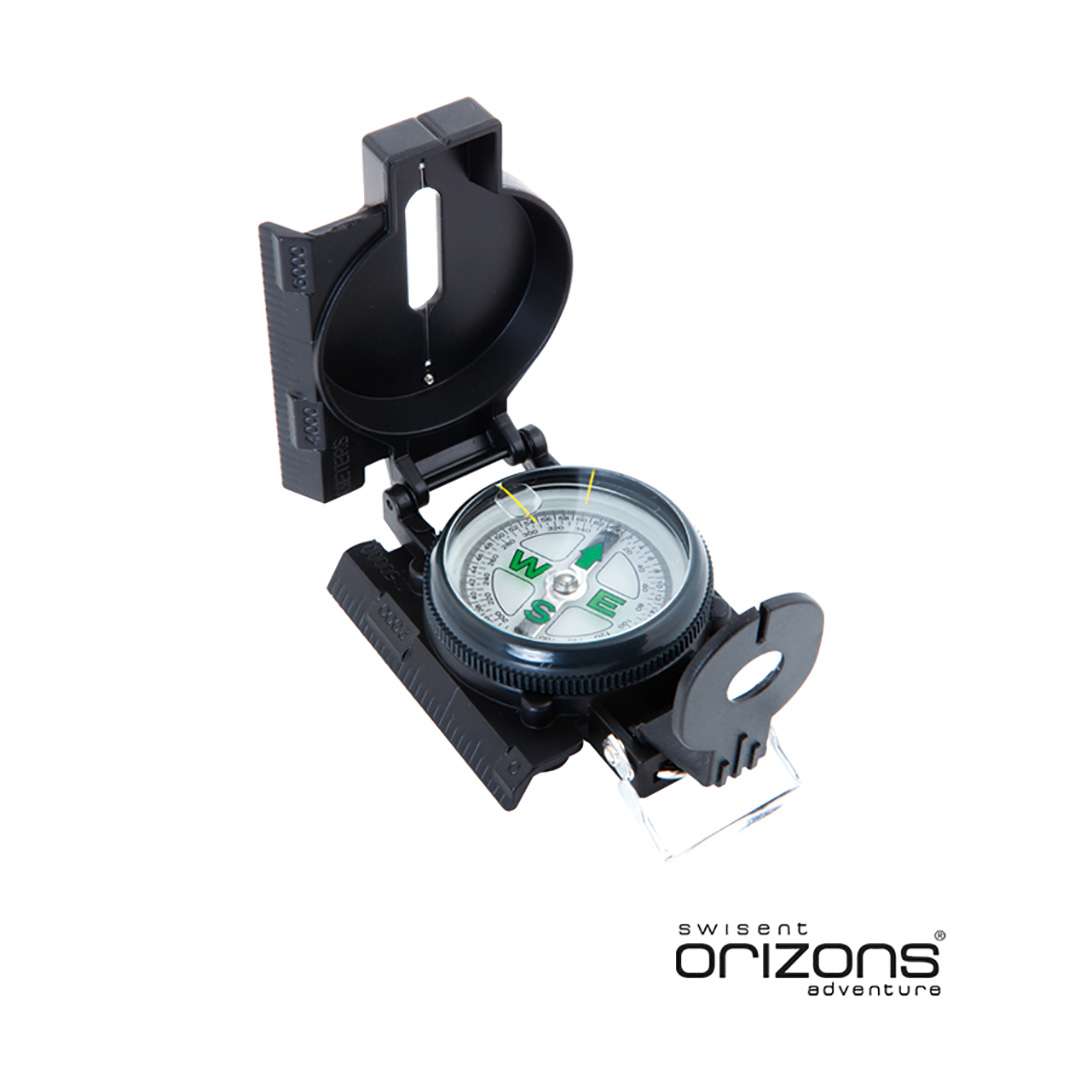 Bussola by Orizons di alta precisione con robusto corpo in alluminio, accessorio di fissaggio e presentata in una scatola dal design accattivante con il logo Orizons.