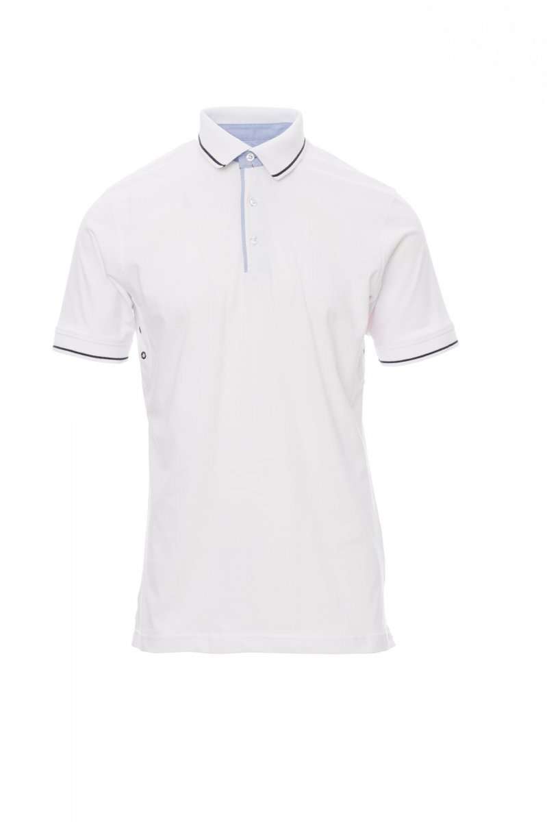 Polo da uomo a manica corta a tre bottoni bianchi, con interno collo, patta e spacchetti laterali in oxford celeste, colletto e bordo manica in rib con fine profilo a contrasto, occhielli sotto braccio, spacchetti laterali con cucitura di rinforzo, nastro di rinforzo laterale, cuciture stretch, rinforzo sagomato retrocollo