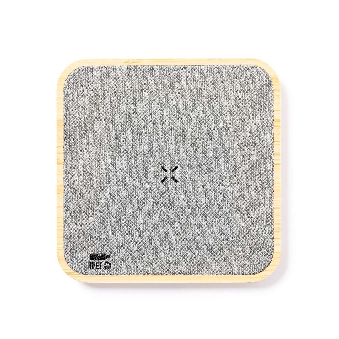 Caricatore wireless da 15 W con design rettangolare. Realizzato in bambù e poliestere RPET, ricavato da plastica riciclata, per promuovere il riutilizzo dei rifiuti plastici e contribuire alla sostenibilità del pianeta. Compatibile con i dispositivi dotati di tecnologia di ricarica wireless Qi. Include un cavo di ricarica di tipo C e un manuale di istruzioni in inglese e spagnolo. Con logo RPET e confezionato in una scatola kraft individuale.Prodotto secondo gli standard RoHS e in conformità ai seguenti requisiti di sicurezza:Sistema di protezione dal surriscaldamento.Sistema di protezione da sovraccarico.Sistema di bloccaggio per evitare cortocircuiti.