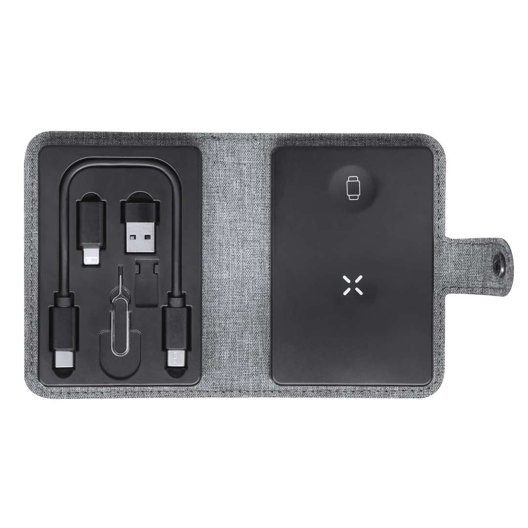Base di ricarica completa realizzata in 300D RPET. Custodia compatta con chiusura a bottone e dock di ricarica wireless Qi per smartphone, auricolari e smartwatch. Fornito con cavo di connessione Type-C ad entrambe le estremità, più adattatori USB e lightning/micro USB. Il set è completato da un estrattore di schede SIM e un vano per riporre una scheda Micro SIM. Con logo RPET.Il materiale RPET è realizzato in plastica riciclata, promuovendo così il riutilizzo dei rifiuti di plastica e contribuendo alla sostenibilità del pianeta.