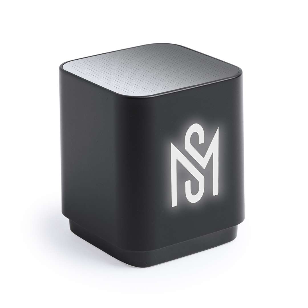 Altoparlante con connessione Bluetooth®, luce LED all'interno e corpo appositamente progettato per la stampa laser, in modo da illuminare il logo. Potenza di 3W e funzione vivavoce. Ricaricabile tramite cavo USB -incluso- e presentato in un'attraente scatola di design.