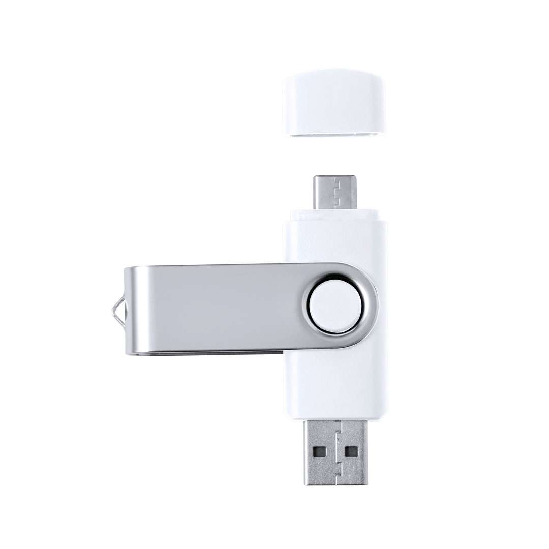 Chiavetta USB 3.0 con capacità di 16 GB. Con clip in metallo e corpo liscio con finitura bianca. Connessioni USB e Tipo-C. Confezionata singolarmente.