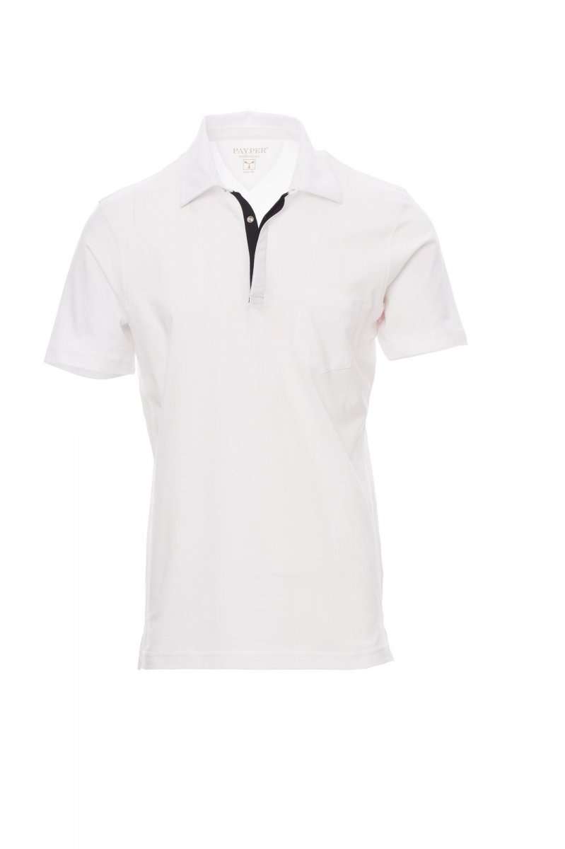 Polo manica corta a tre bottoni automatici a clips di metallo, apertura frontale del collo più fine e profonda, etichetta transfer, taschino lato cuore.
