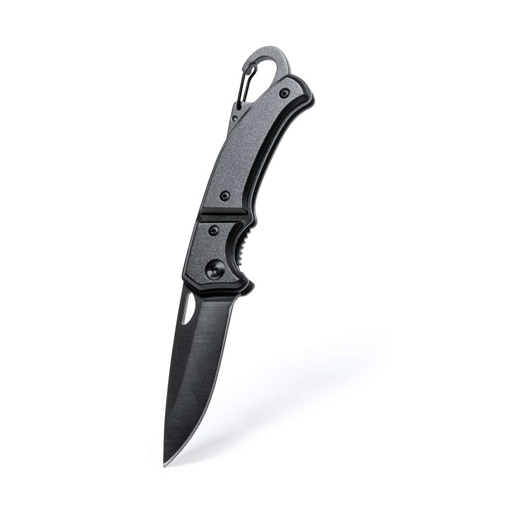 Coltello con lama in acciaio inox con finitura nera e manico in alluminio robusto abbinato. Con moschettone integrato nell'impugnatura e chiusura di sicurezza. Con lama fustellata per una facile apertura e confezionato in una scatola di design nera.