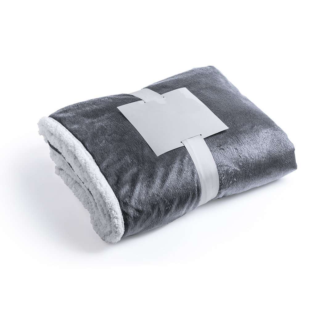 Coperta 125x160 cm con elegante design bicolore. In morbida e calda combinazione di pile corallo e sherpa da 380 g/m2. Presentata in nastro con lamina per una facile stampa.