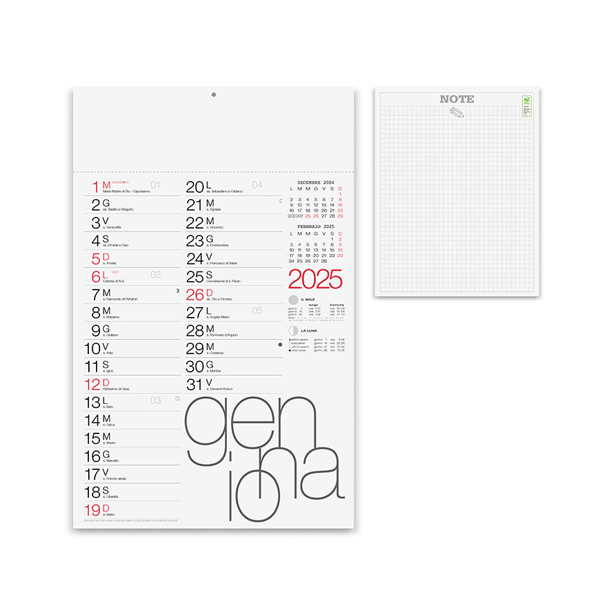 illustrato mensile 12 fogli ; carta patinata 70gr ; testata termosaldata ; festività internazionali ; retro in quadricromia ; tecnica di stampa consigliata: adesivo digitale - serigrafica