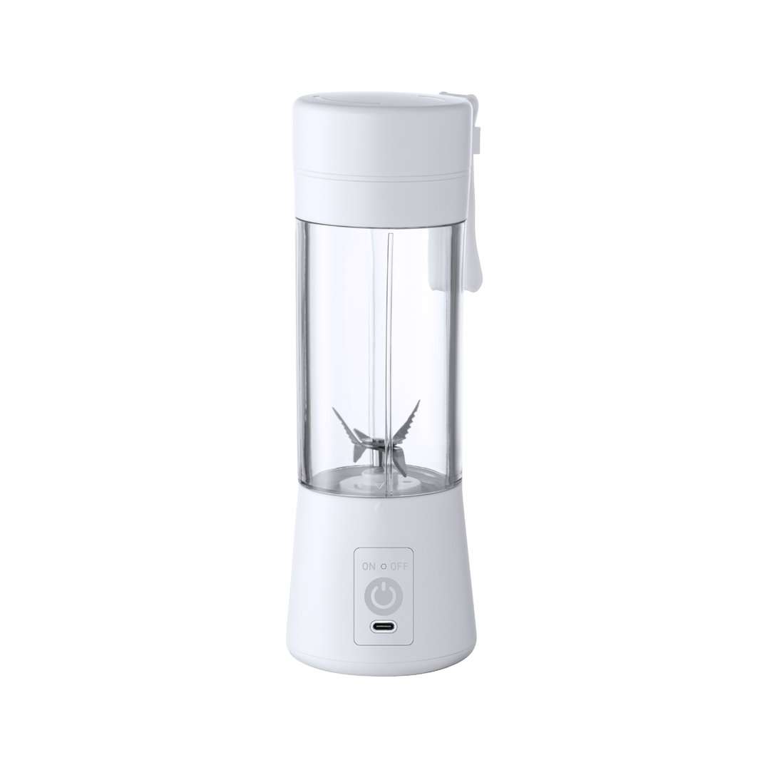 Frullatore realizzato in resistente materiale ABS con finitura bianca. Capacità di 380 ml e potenza di 150 W, con pulitore e pinzette inclusi. Batteria da 2.000 mAh, con connessione di tipo C (cavo incluso). Presentato singolarmente in una scatola di design kraft, con manuale di istruzioni in inglese e spagnolo.
