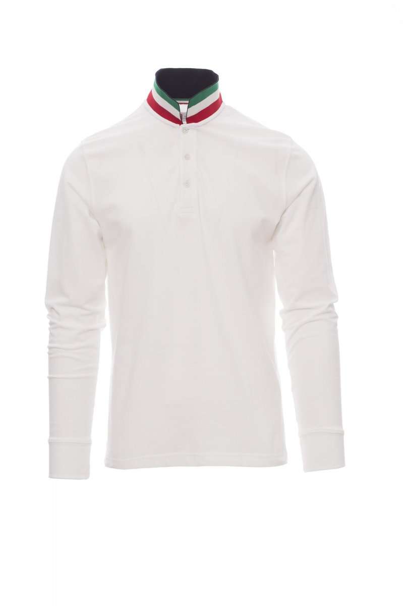 Polo da uomo manica lunga a 3 bottoni in tinta ad effetto perlato, colletto da un lato in tinta, dall'altro lato a contrasto tricolore, visibile solo se alzato, interno abbottonatura collo e spacchetti laterali con inserto tricolore, colletto e polsino a costine, cuciture del collo coperte, nastro di rinforzo laterale, rinforzo sagomato retro collo.