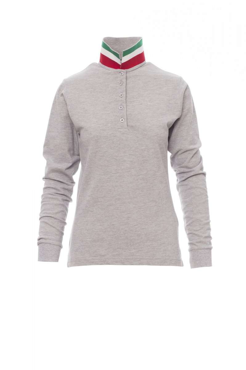 Polo sfiancata da donna manica lunga a cinque bottoni in tinta ad effetto perlato, colletto da un lato in tinta, dall'altro lato a contrasto tricolore, visibile solo se alzato, interno abbottonatura collo e spacchetti laterali con inserto tricolore, colletto e polsino a costine, cuciture del collo coperte, nastro di rinforzo laterale, rinforzo sagomato retrocollo