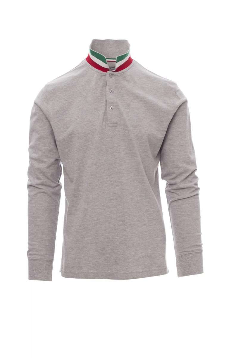 Polo da uomo manica lunga a tre bottoni in tinta ad effetto perlato, colletto da un lato in tinta, dall'altro lato a contrasto tricolore, visibile solo se alzato, interno abbottonatura collo e spacchetti laterali con inserto tricolore, colletto e polsino a costine, cuciture del collo coperte, nastro di rinforzo laterale, rinforzo sagomato retrocollo