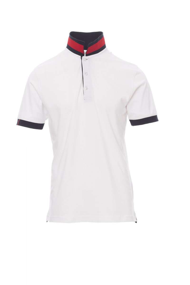 Polo da uomo a manica corta a 3 bottoni in tinta ad effetto perlato, colletto da un lato in tinta dall'altro lato con colori a contrasto a fasce, visibile solo se alzato. Interno abbottonatura collo e spacchetti laterali con contrasto, bordo manica dx con fine inserto nei colori del collo, bordo manica a costine, cuciture del collo coperte con nastro a contrasto, nastro di rinforzo laterale, rinforzo sagomato retro collo.