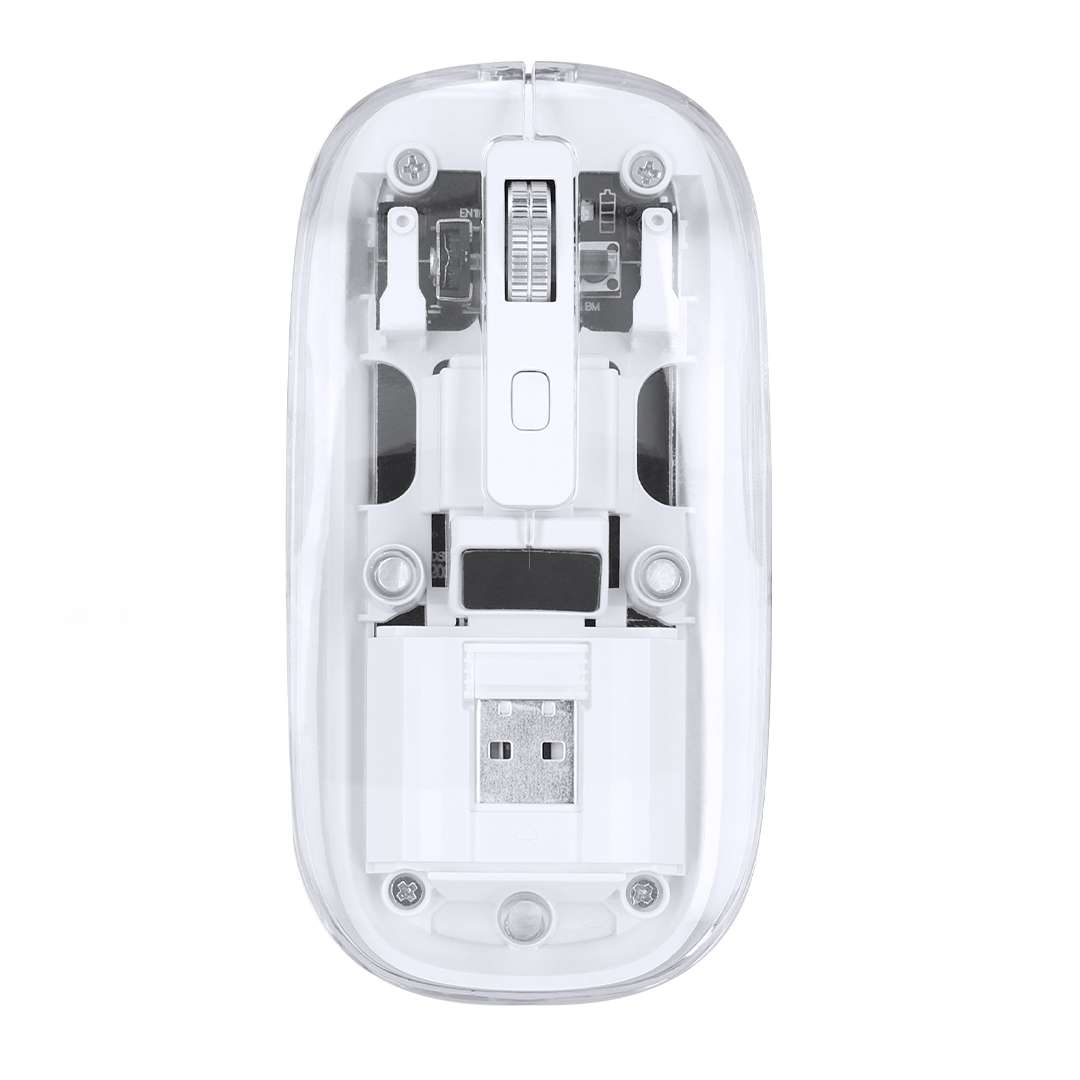 Mouse ottico wireless dal design originale, con corpo trasparente che consente di vedere i componenti interni del dispositivo. Con batteria integrata da 300 mAh e porta di ricarica Type-C (cavo incluso). Include pulsante DPI, connessione USB plug and play ed è confezionato in una scatola kraft individuale.