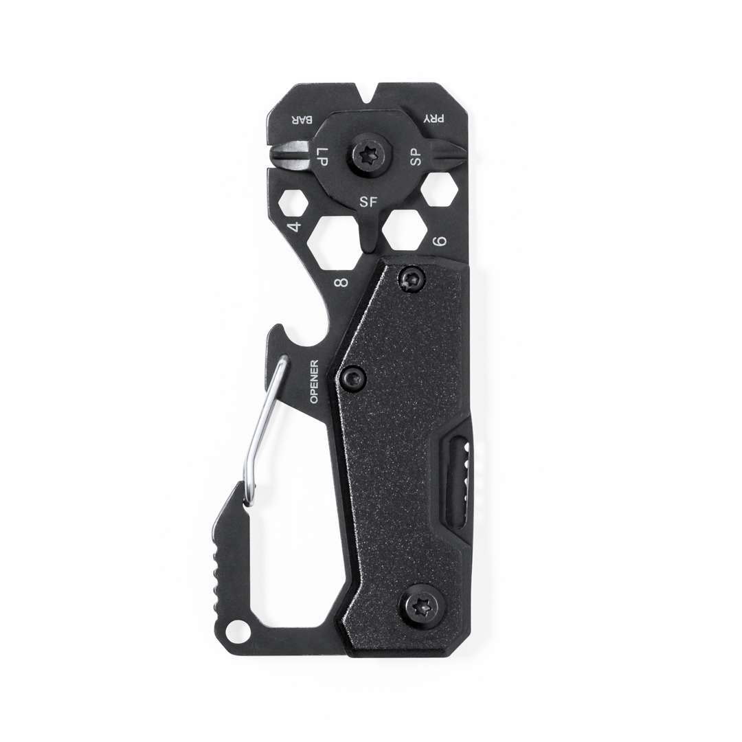 Eccellente multiutensile in alluminio e acciaio inox con finitura nera. Include 13 funzioni diverse: chiave per dadi esagonali di varie dimensioni, moschettone, apriscatole, righello, raschietto, coltello, cacciavite piatto e a croce. Presentato in una scatola kraft di design.