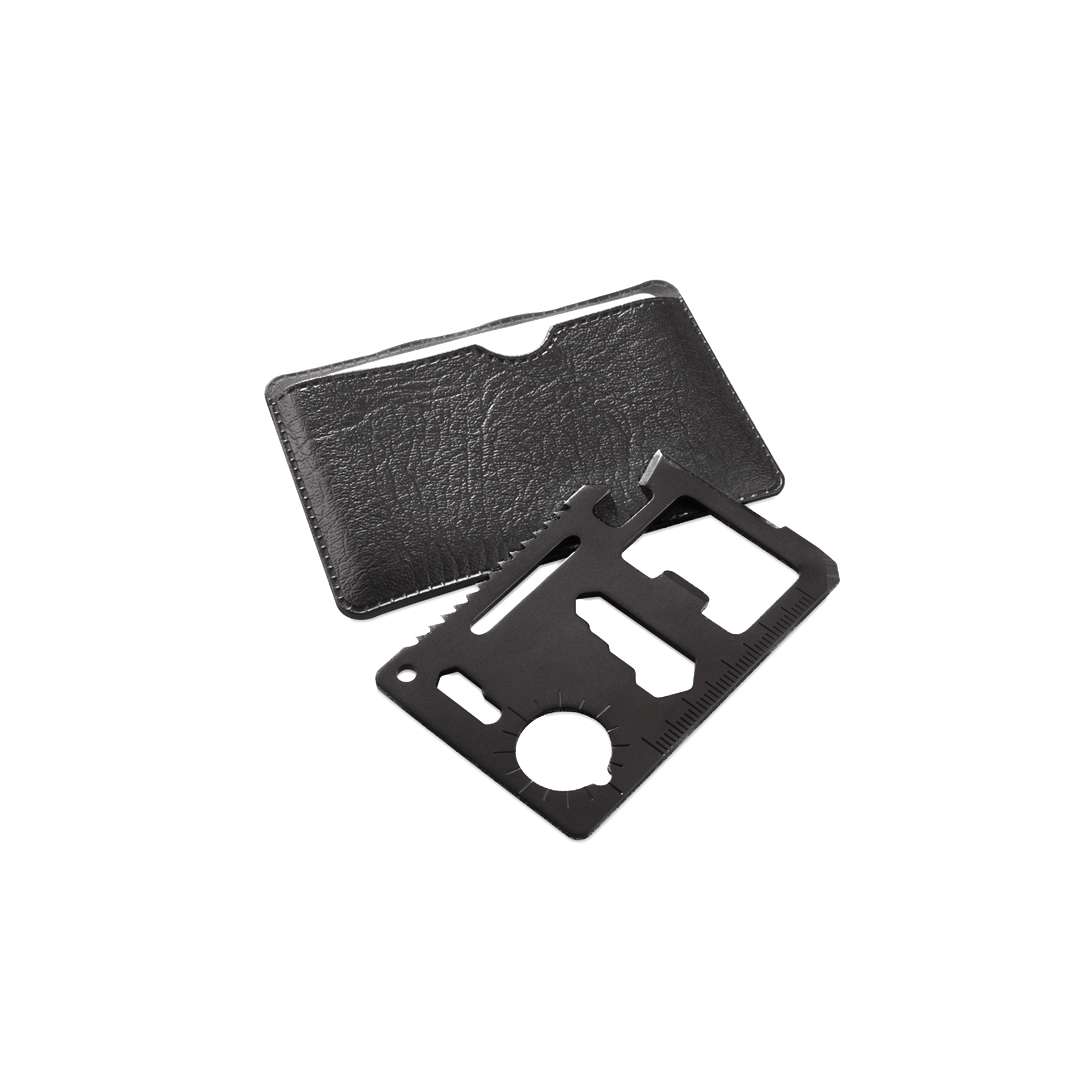 Multiutensile con corpo in robusto acciaio inossidabile con 11 strumenti. Con apriscatole, coltello, cacciavite, righello, apribottiglie, chiave inglese, chiave a farfalla, sega e indicatore di direzione. Presentato in una resistente custodia in similpelle.