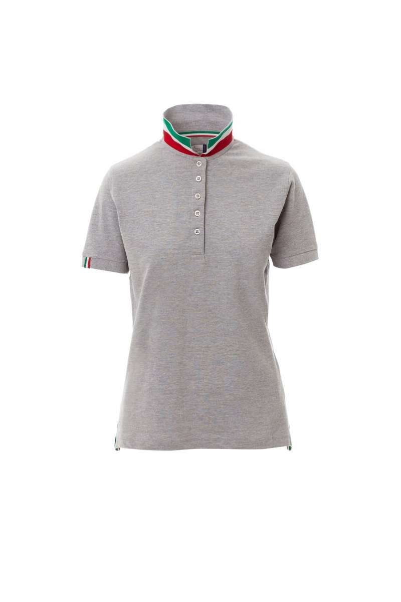 Polo sfiancata donna manica corta a cinque bottoni in tinta ad effetto perlato, colletto da un lato in tinta, dall'altro lato a contrasto con colori bandiera visibile solo se alzato, bordo manica dx con fine inserto colori bandiera in contrasto, colletto e bordo manica a costine, spacchetti laterali colori bandiera, cuciture del collo coperte con nastro in jersey colori bandiera, nastro di rinforzo laterale, rinforzo sagomato retrocollo.