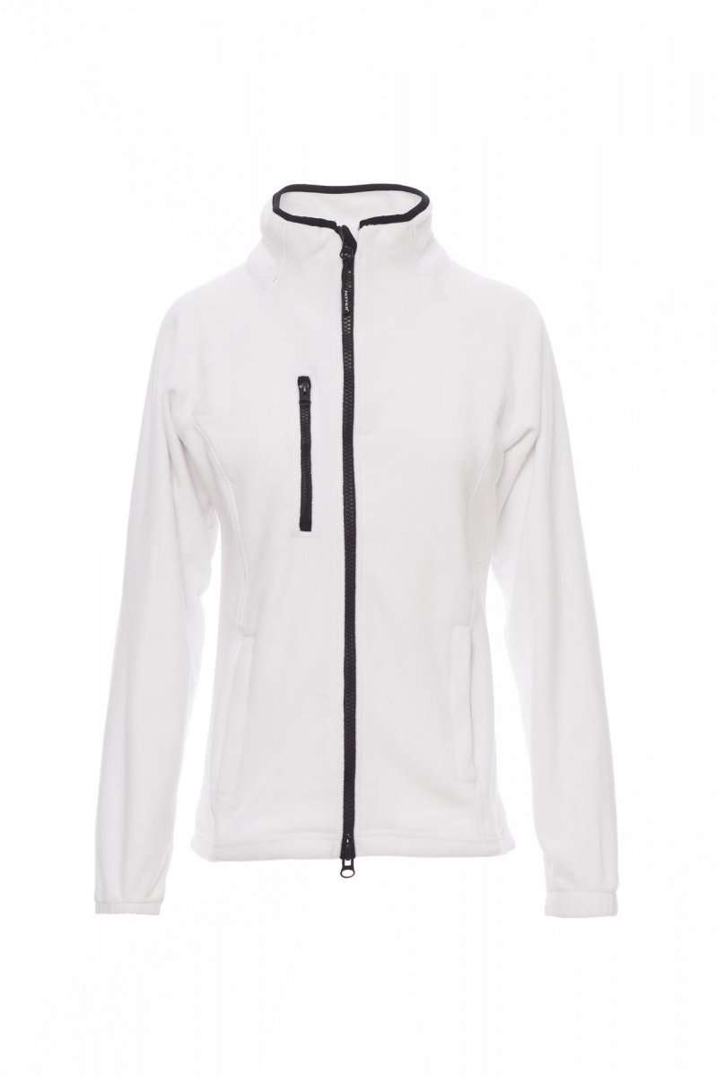 Pile sfiancato da donna, zip intera 8mm in plastica nera, manica raglan, coulisse regolabile in vita, elastici stringi polso, due tasche con zip coperte, una tasca frontale con zip, collo con bordatura di rinforzo in contrasto, cuciture rinforzate.
