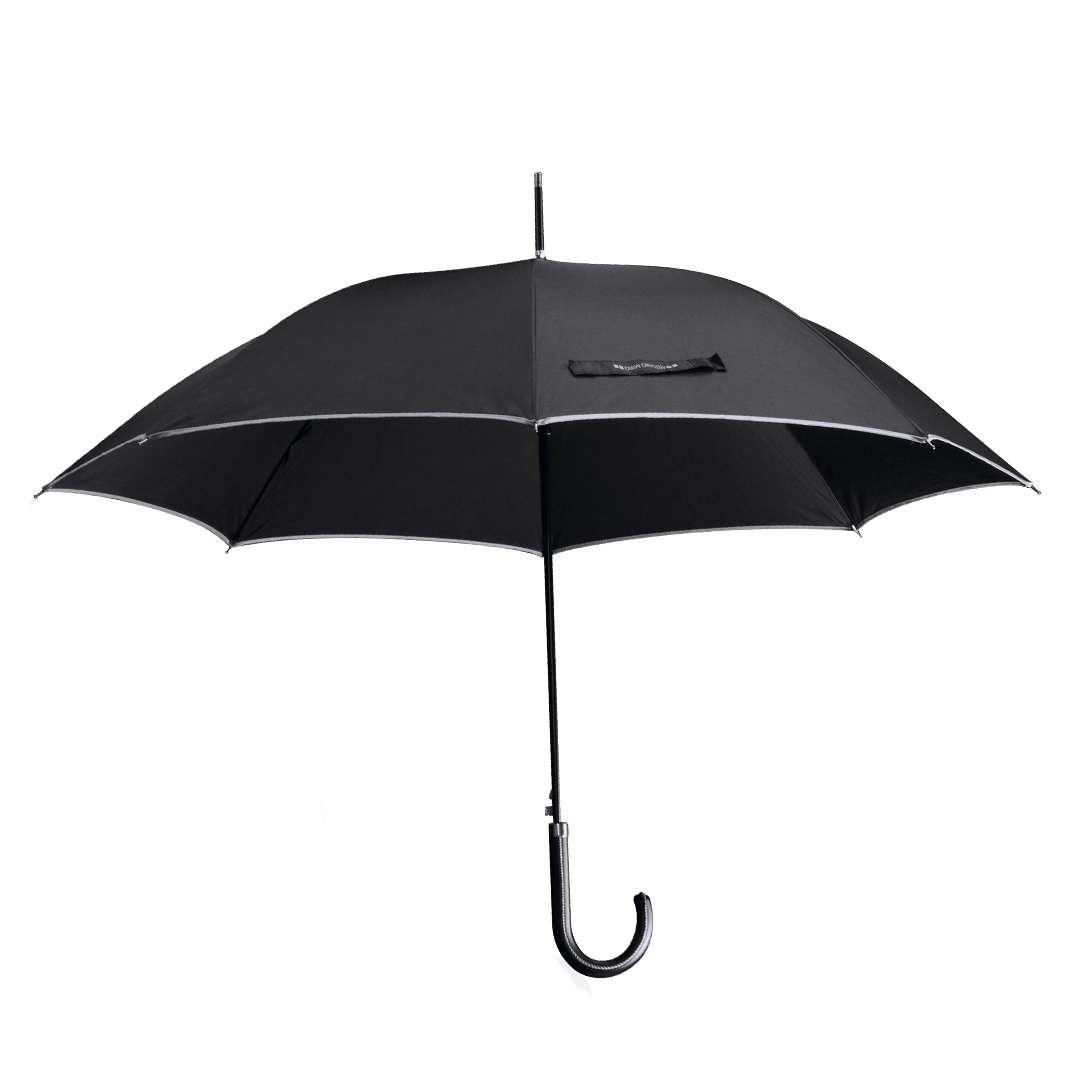 Ombrello by Antonio Miró a 8 pannelli, dall'elegante design nero con finiture bianche. Di 100 cm di diametro, con apertura automatica e in resistente materiale pongee. Con aste metalliche nere, chiusura in velcro e manico in similpelle soft touch. Include una cinghia di chiusura con chiusura regolabile e il logo del marchio.