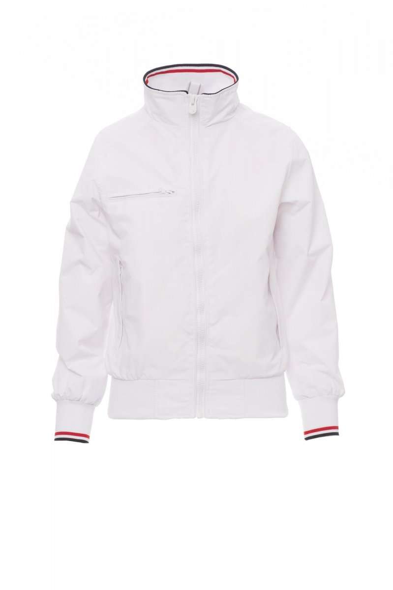 Giubbotto ergonomico da donna, zip da 8mm, in plastica con cursore in metallo, con colletto, polsini e vita in rib elasticizzato con righe, due tasche esterne con zip in plastica. Interno non imbottito, retinato, una tasca con cerniera porta smartphone con predisposizione per cavo, zip al petto e schiena per agevolare stampe e ricami.