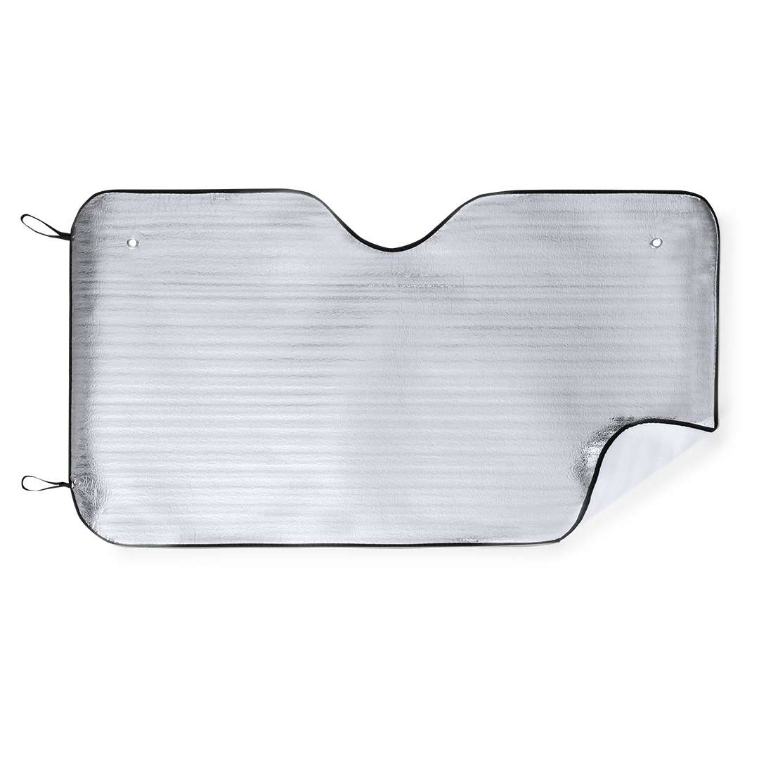 Parasole a una faccia in alluminio color argento con finitura metallizzata e bordatura in poliestere nero. Dimensioni 130x70cm e imbottitura sul retro. Cinghie elastiche pieghevoli con anelli di rinforzo metallici, due ventose per la regolazione nel lunotto e spedito steso per una facile stampa