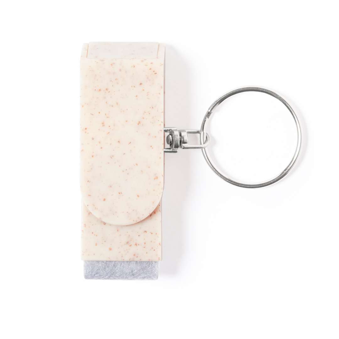 Portachiavi supporto per smartphone della linea natura, realizzato in fibra di grano. Con meccanismo girevole e accessorio pulisci schermo incluso. Anello in metallo cromato.La fibra di grano promuove l'utilizzo di materie prime naturali, riducendo così le emissioni inquinanti.