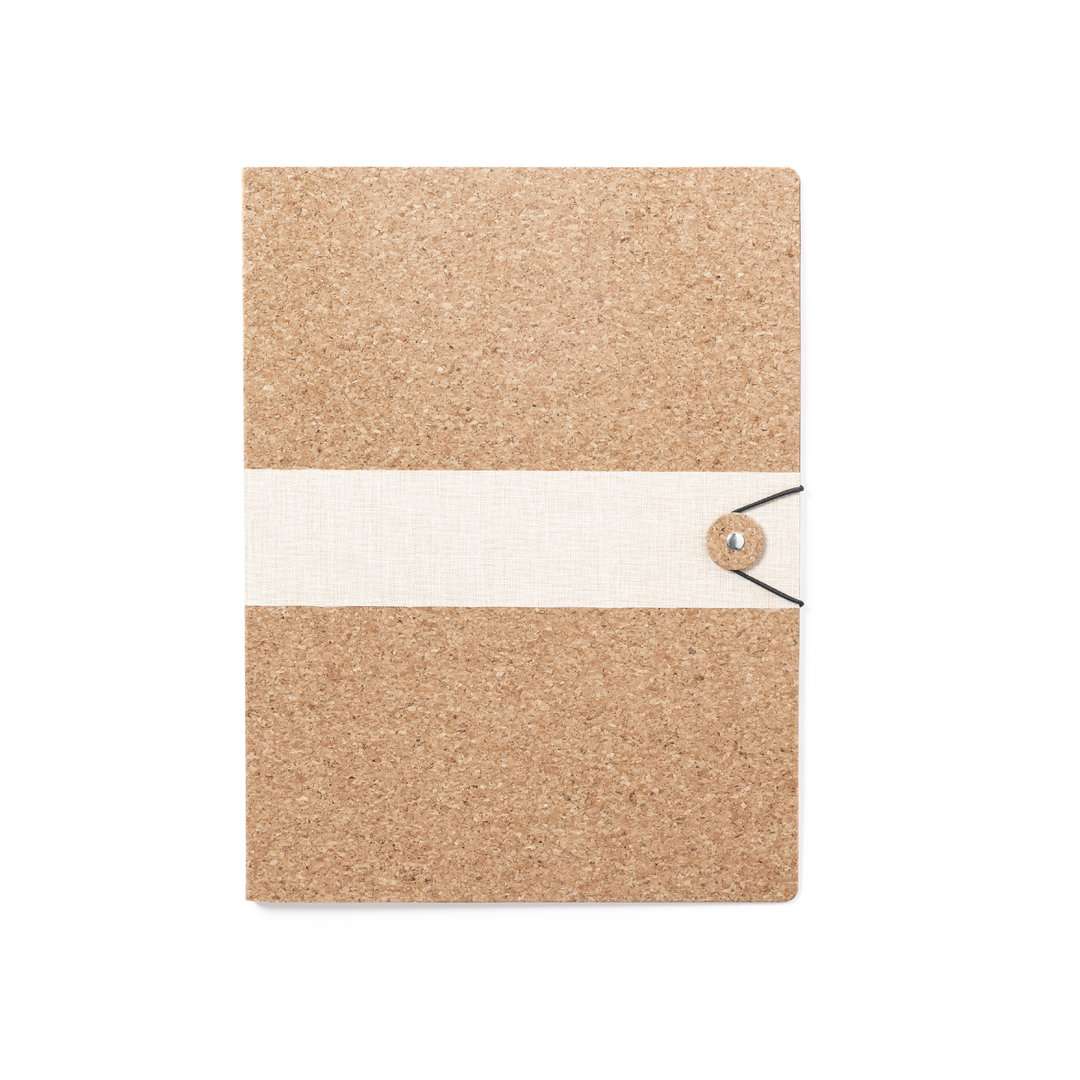 Cartella della linea natura con esterno in sughero naturale e fascia centrale in lino con finitura ecrù. Chiusura elastica.