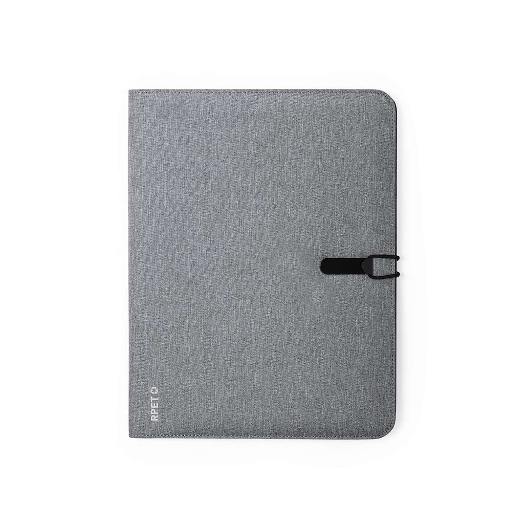 Elegante cartella della linea natura in formato A4. Realizzato in resistente RPET 600D effetto melange, plastica riciclata per favorire il riutilizzo dei rifiuti plastici e contribuire alla sostenibilità del pianeta. Dettagli neri e chiusura in metallo con nastro elastico appositamente progettato per la stampa laser. Interno con taccuino rimovibile da 20 fogli a righe singola, 3 tasche con patta, portacarte e portapenne. Etichetta distintiva con logo RPET nell'angolo.