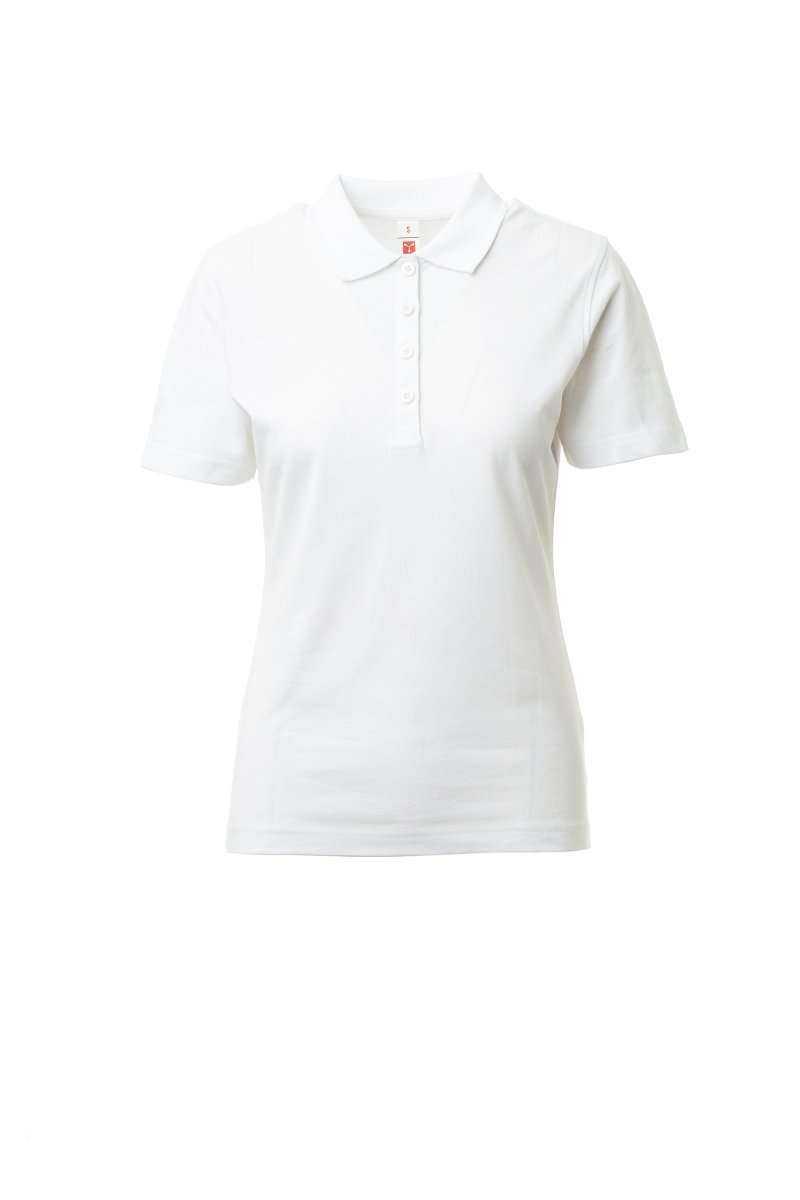 Polo sfiancata da donna a manica corta con 4 bottoni in tinta effetto perlato, spacchetti laterali, cuciture del collo coperte con nastro in tinta.