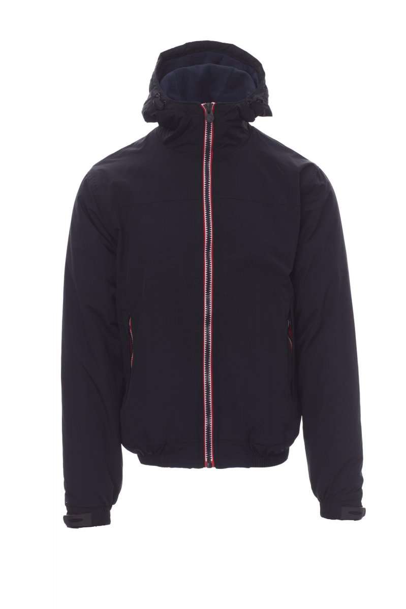 Giubbotto da uomo imbottito, zip da 8mm in contrasto, cappuccio sagomato con due cuciture e coulisse, elastico in vita, polsini con elastico e stringi polsi gommati di regolazione, due tasche esterne con zip coperta. Interno in micropile nel colletto e schiena, una tasca con cerniera porta smartphone con predisposizione per cavo, zip al petto e schiena per agevolare stampe e ricami.