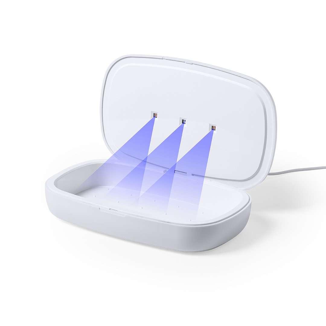 Scatola sterilizzante a luce ultravioletta di tipo C, con caricatore wireless per smartphone integrato nel coperchio. Appositamente progettato per l'eliminazione di microrganismi e batteri negli oggetti di uso quotidiano come smartphone, chiavi, occhiali, maschera, cuffie, smartwatch ... Made in materiale ABS resistente con una finitura opaca e presentato in una scatola dal design accattivante. Facile da usare, basta mettere l'oggetto all'interno della scatola. Potenza lampadina 1W Lunghezza d'onda 270-280 nm, alimentata da un cavo USB di tipo C lungo 1 m con colore corrispondente. Tempo di sterilizzazione di 5 e 10 minuti con funzione di autospegnimento. Manuale utente disponibile in spagnolo e inglese. Disponibili certificazioni CE, RoHS e efficacia germicida. Per un corretto utilizzo del prodotto, evitare il contatto con la pelle e gli occhi