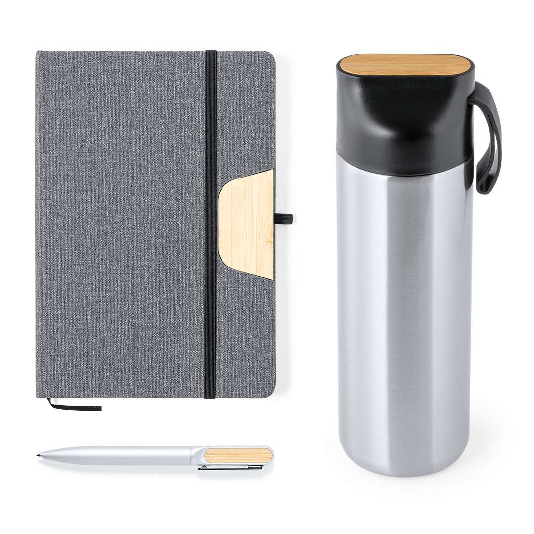 Elegante set premium, che comprende:Tazza thermos a doppia parete in acciaio inox. Capacità di 640 ml, con area in bambù sul coperchio per il branding. Blocco note in morbido PU con porta smartphone integrato sulla copertina e area in bambù per il branding. Include chiusura elastica, segnalibro e portapenne in coordinato. Allinterno 80 fogli di layout a righe. Penna a sfera in alluminio con finitura opaca, area in bambù per il branding, meccanismo a rotazione e inchiostro blu. Presentata in un astuccio individuale con finitura opaca e chiusura magnetica, con fustellatura interna per ciascuno degli elementi del set.