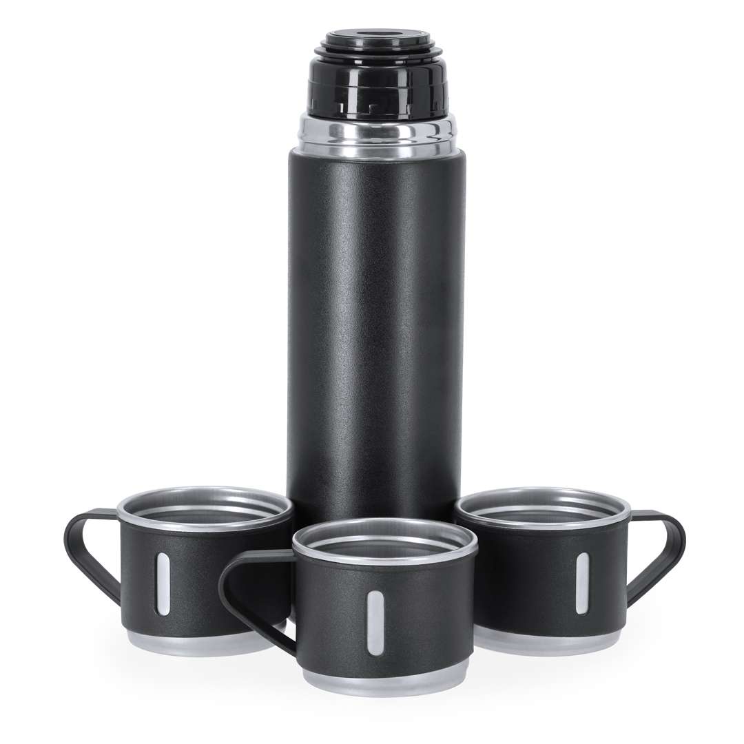 Set di bottiglia termica e 3 tazze in acciaio inossidabile. Termos a doppia parete con capacità di 420 ml, garantendo una migliore e più duratura conservazione della temperatura, con distributore di sicurezza. Tazze da 140 ml con regolazione a vite in un elegante design nero, ottimo per gustare una bevanda calda o fredda, in qualsiasi momento e ovunque. Presentato in un elegante astuccio nero.