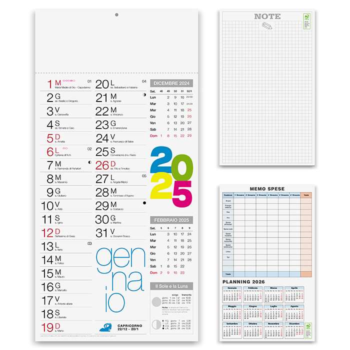 olandese mensile 12 fogli ; carta patinata 70gr ; testata termosaldata ; festività internazionali ; pagina note stampata sul retro ; memo spese in ultima pagina ; tecnica di stampa consigliata: adesivo digitale - serigrafica