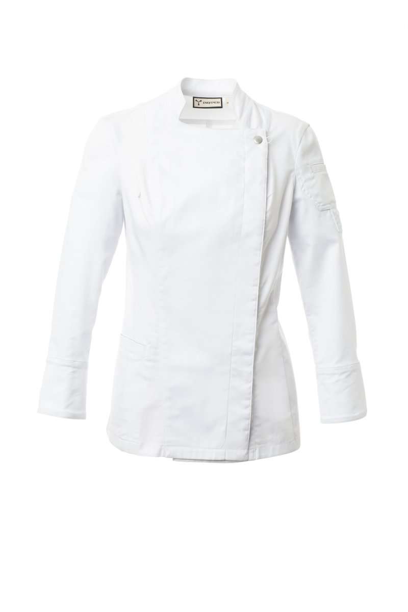 Giacca da cuoca con collo alla coreana, realizzata in twill di cotone e Lycra® T400®, con ottime proprietà elastiche e traspiranti. Chiusura a doppio petto con bottoni automatici, lembo ripiegabile e fissabile al petto mediante allaccio ad un bottone a vista, che crea lâeffetto di un bavero sartoriale e di un innovativo scollo a V. Manica lunga con polsino chiuso da bottone a pressione a vista. Iconica toppa sagomata sulla spalla sinistra, con ricamo ad elica tono su tono, provvista di taschino porta penne. Pratica tasca porta smartphone in vita. Spacchi verticali nel fondoschiena per facilitare i movimenti.