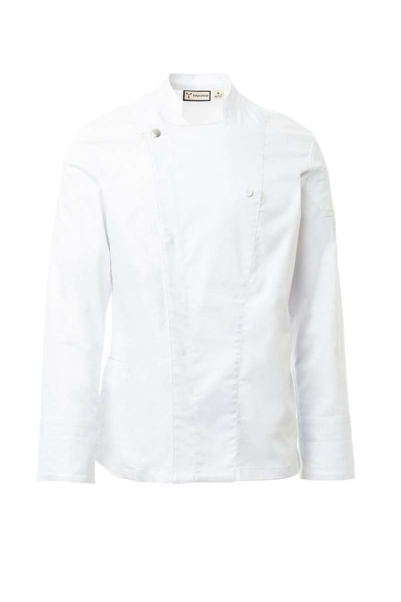 Giacca da cuoco con collo alla coreana, realizzata in twill di cotone e Lycra® T400®, con ottime proprietà elastiche e traspiranti. Chiusura a doppio petto con bottoni automatici, lembo ripiegabile e fissabile al petto mediante allaccio ad un bottone a vista, che crea l’effetto di un bavero sartoriale e di un innovativo scollo a V. Manica lunga con polsino risvoltabile, lunetta in tessuto a rete nel sotto giromanica, per agevolare la traspirazione. Iconica toppa sagomata sulla spalla sinistra, con ricamo ad elica tono su tono, provvista di taschino porta penne. Pratica tasca porta smartphone in vita. Spacchi verticali nel fondoschiena per facilitare i movimenti.