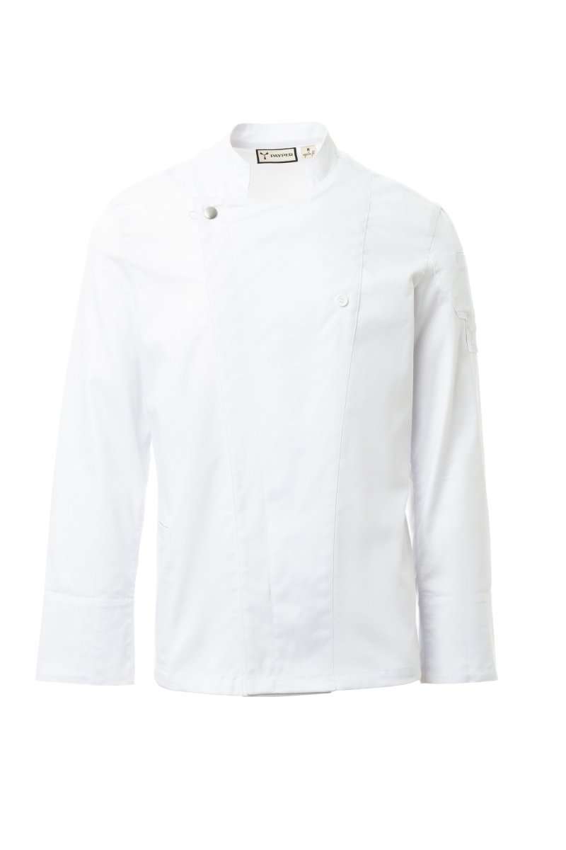 Giacca da cuoco con collo alla coreana, realizzata in twill di cotone e Lycra® T400®, con ottime proprietà elastiche e traspiranti. Chiusura a doppio petto con bottoni automatici, lembo ripiegabile e fissabile al petto mediante allaccio ad un bottone a vista, che crea l’effetto di un bavero sartoriale e di un innovativo scollo a V. Manica lunga con polsino risvoltabile, lunetta in tessuto a rete nel sotto giromanica, per agevolare la traspirazione. Iconica toppa sagomata sulla spalla sinistra, con ricamo ad elica tono su tono, provvista di taschino porta penne. Pratica tasca porta smartphone in vita. Spacchi verticali nel fondoschiena per facilitare i movimenti.