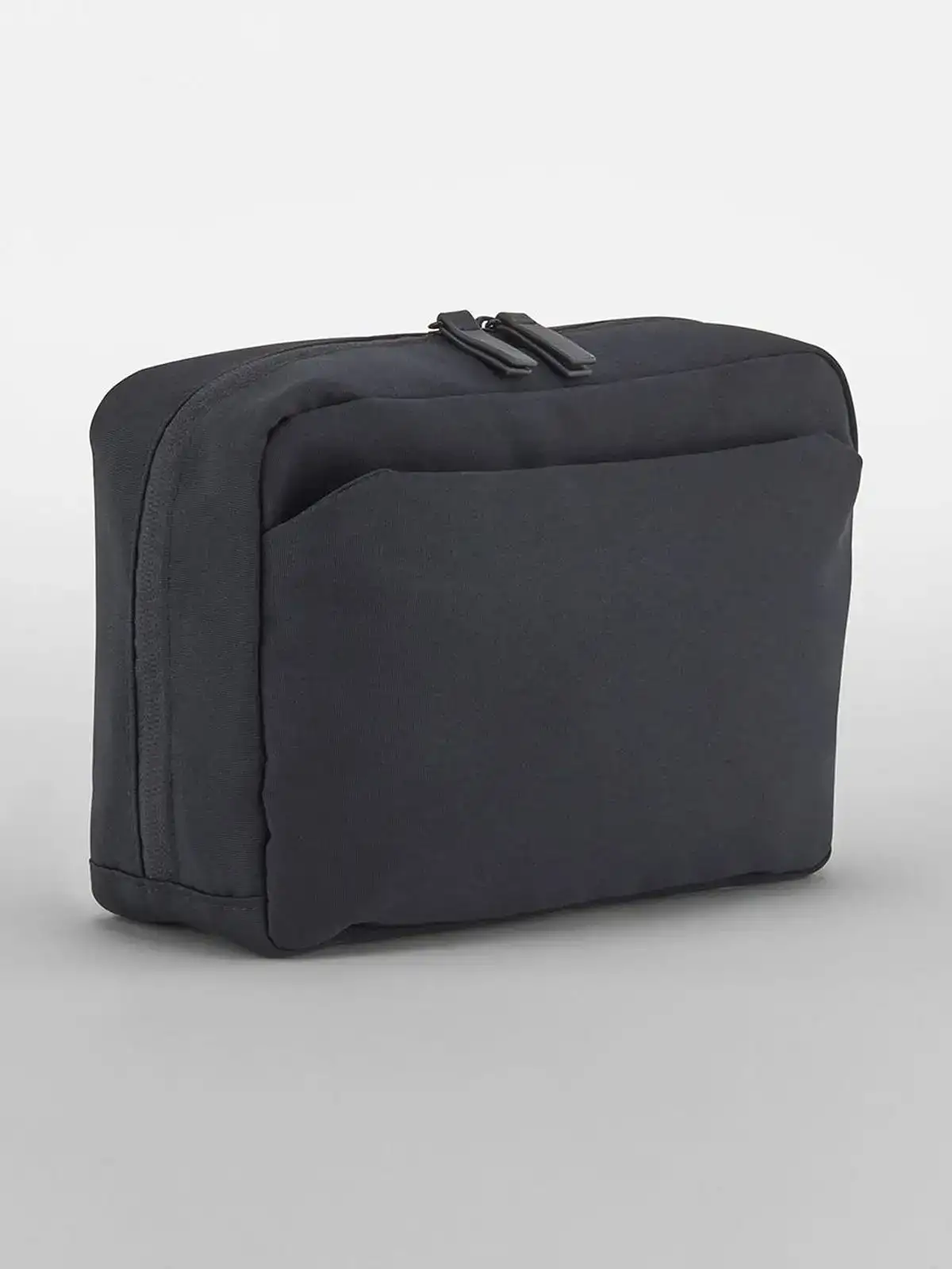 100% poliestere riciclato. Organizer per accessori tecnologici, tessuto idrorepellente, tasca frontale con zip, tasca interna con zip, due tasche interne portaoggetti, tasche interne a rete. Dimensioni: 26x20x8cm, Capacità: 4 litri. Etichetta strappabile.