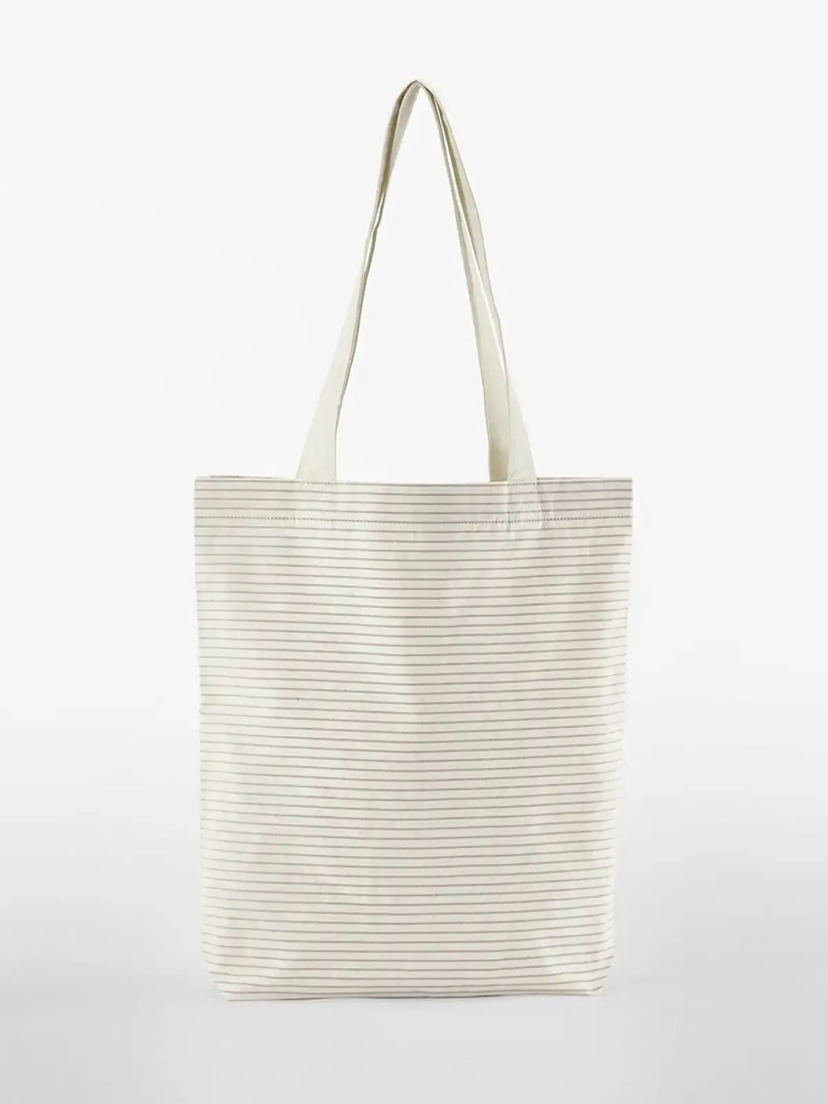 100% cotone organico. Shopper a righe in cotone organico certificato GOTS - CU811033, può essere portata a mano o in spalla. Etichetta removibile. Lunghezza manici: 67 cm. Dimensioni: 29x42x8 cm, capacità: 10 litri, area stampabile: 27x36 cm.