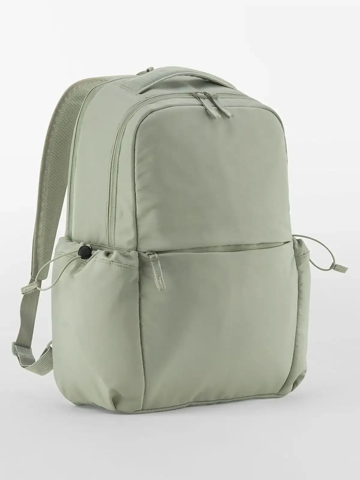100% poliestere riciclato. Zaino per laptop fino a 16'' in poliestere riciclato certificato GRS, apertura con due zip bidirezionali, tasche laterali esterne regolabili con cordino, tasca frontale con zip e due tasche interne imbottite, cinghia posteriore per bagaglio. Dimensioni: 44x29x13cm, Capacità: 22 litri. Etichetta strappabile.